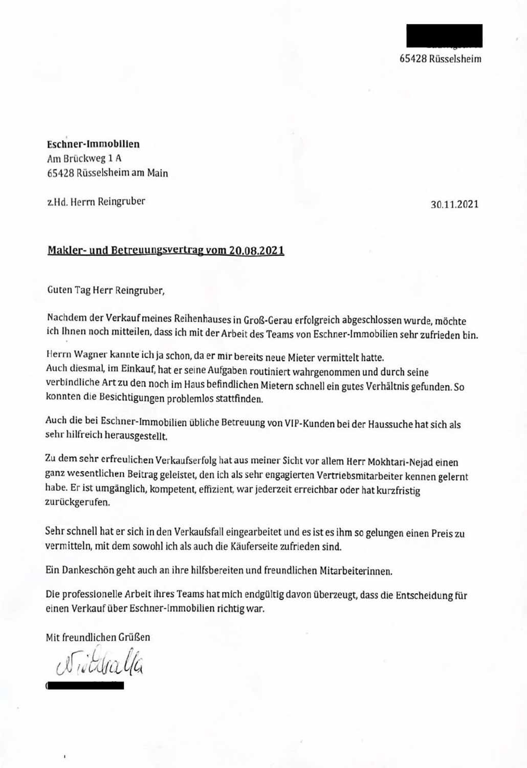 Guten Tag Herr Reingruber, Nachdem der Verkauf meines Reihenhauses in Groß-Gerau erfolgreich abgeschlossen wurde, möchte ich Ihnen noch mitteilen, dass ich mit der Arbeit des Teams von Eschner-Immobilien sehr zufrieden bin Herrn Wagner kannte ich […]